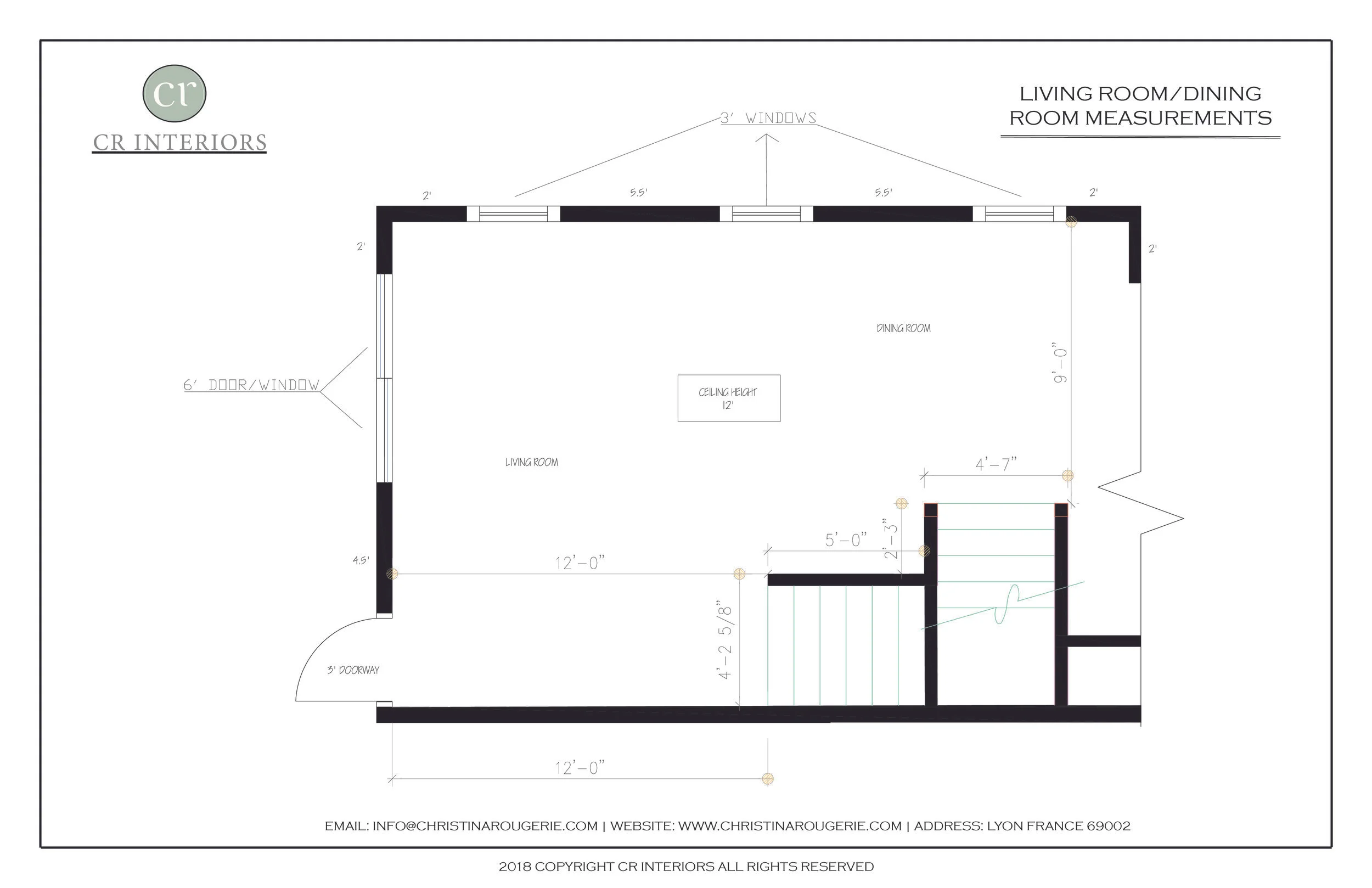 Second part is measuring out your space(s) you want to redesign. This is the most important part of designing because this shows us what size of furniture pieces we can fit in this one space. Without this, you sacrifice scale and could end up buying a furniture piece that is too large or too small. Measure out the length and height of the walls in the windows and doors, so you know how much wall space you have. Also, the door whether it swings inward or outward, you don’t want to buy a sofa and the door bumps into it. Also get the ceiling and window height. See below for an example of this.